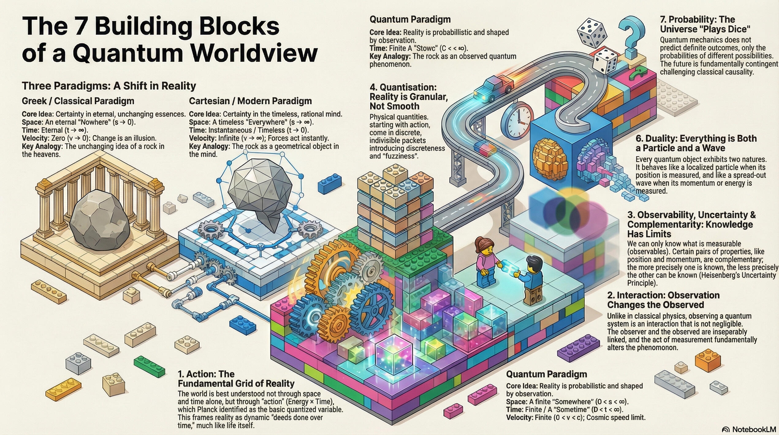 The book systematically explores seven foundational principles—Quantisation, Action, Velocity Limit, Duality, Probability, Uncertainty, and Interaction—to fundamentally reshape traditional notions of epistemology, ontology, and logic. It challenges the reader to view reality not through the passive grid of space and time, but through the active lens of the quantum of action, reinterpreting physical reality as life itself—energy exercised over time—to recover some of the insights of vitalist philosophies.